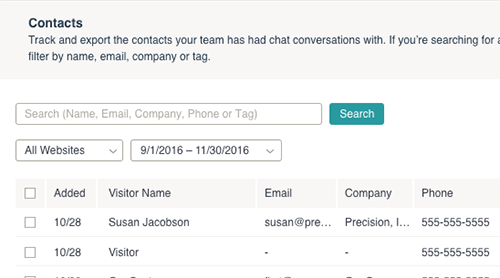 You can also use the search bar and dropdowns to filter contacts by website, date, operator, email, phone number and keyword.