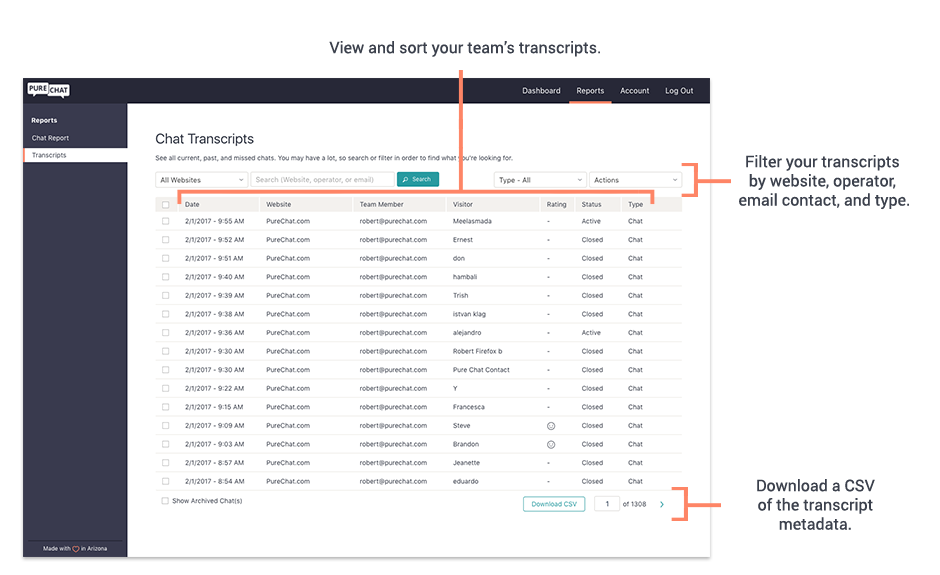 Use the filtering options to view transcripts by website or keyword, such as the operator or contact email address.